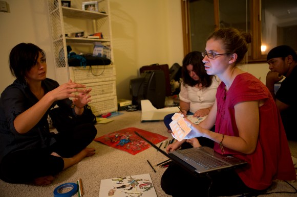 Jillia explains her creative vision for the next scene to Becky while Cat sketches in the background. Photo by Mark R. Brown.