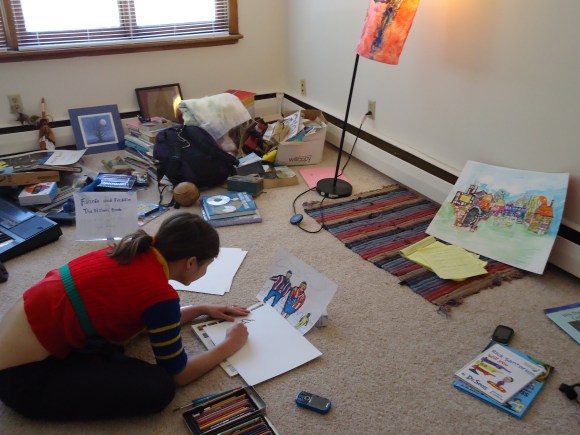 The illustrations for this book draw from a phenomenal talent pool. We pooled our art supplies and children’s books and turned  Becky’s unfurnished apartment into an illustration studio as everyone spread out on the floor and worked together. Connie drew our main Homeville backdrop. Dan stopped by almost unannounced and whipped up an incredible Vegas scene out of his head. Eva spent hours upon hours perfecting our three main characters. Caylin, Kat, Cat, and Becky worked on miscellaneous characters and props. Becky found the ocean on a postcard Elizabeth painted in 2005.