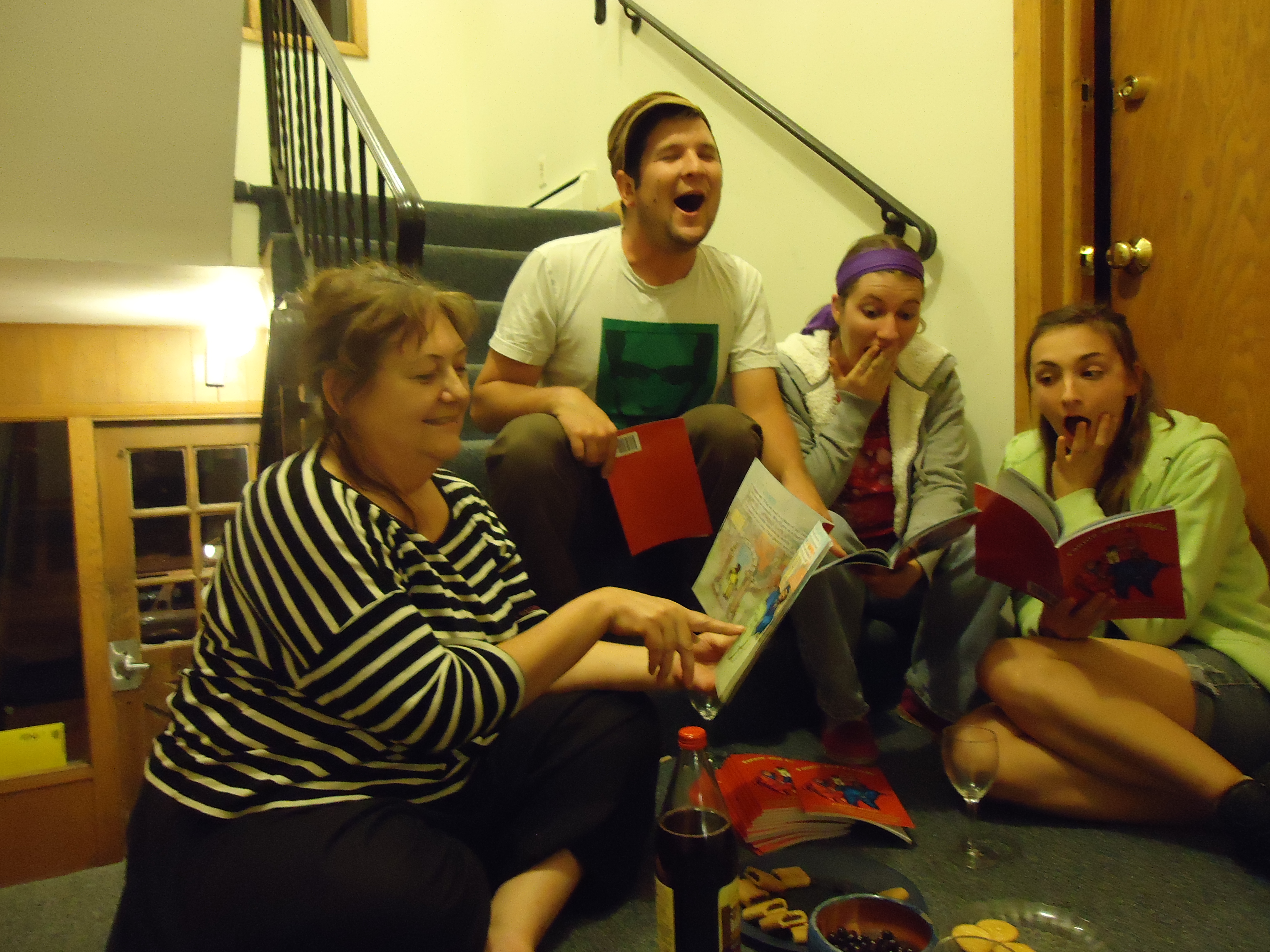 “Fannie and Freddie” captures its first audience–the illustrators! From left to right, Connie, Dan, Caylin, Kat. Photo by Becky.